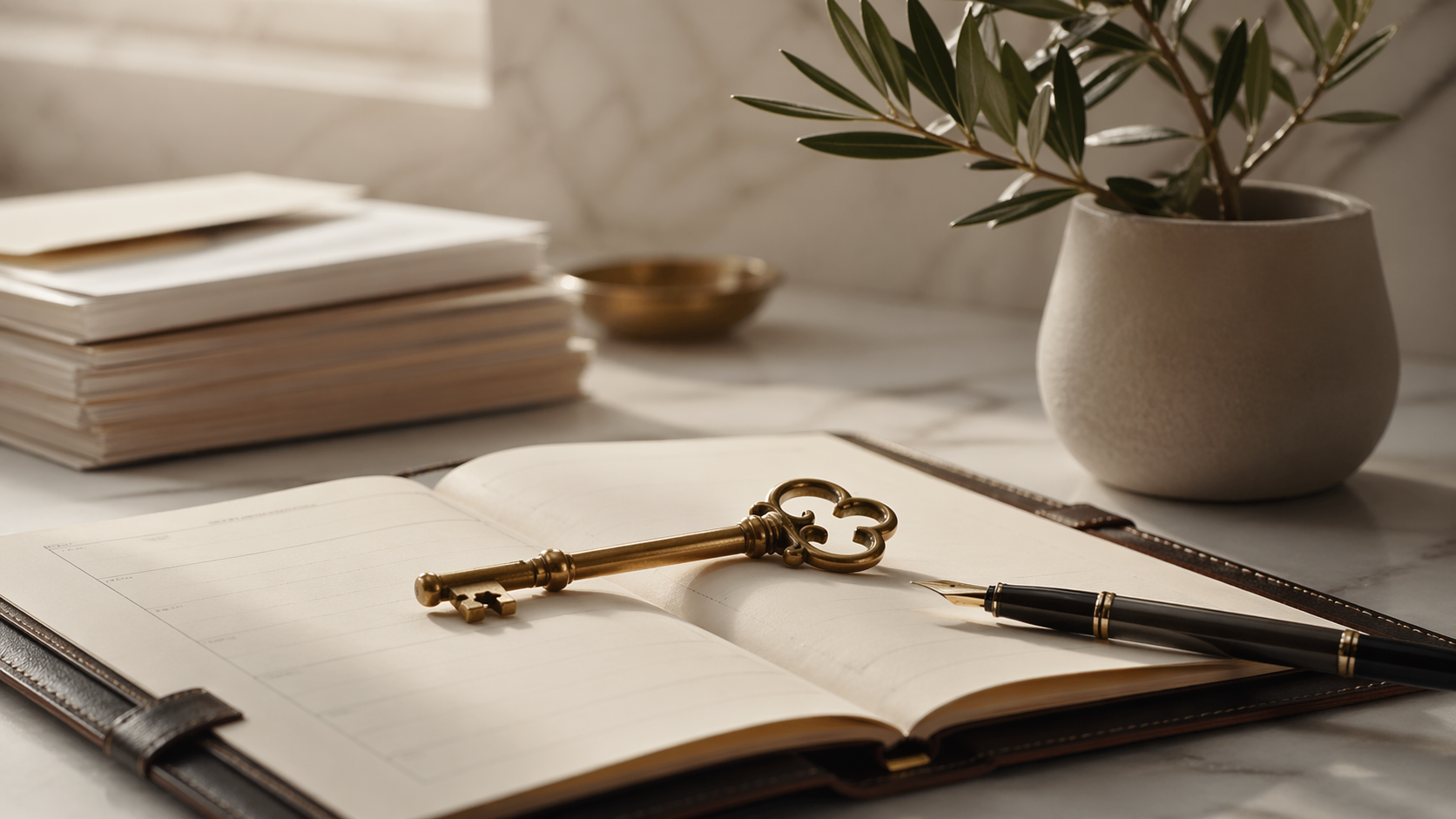 Chave dourada sobre agenda de couro aberta, simbolizando planejamento patrimonial e construção de riqueza de longo prazo