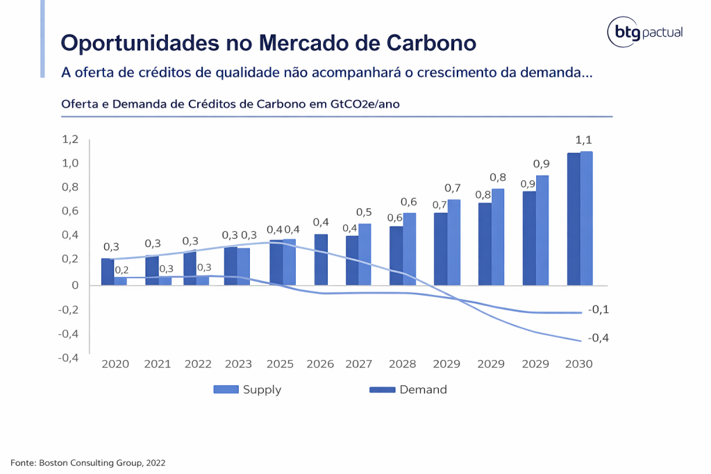 Esse descompasso resultará em um mercado desequilibrado para todo o período de 2024 a 2030, criando desafios e oportunidades para investidores e empresas comprometidas com a sustentabilidade – confira o gráfico a seguir, produzido pelo BTG Pactual.